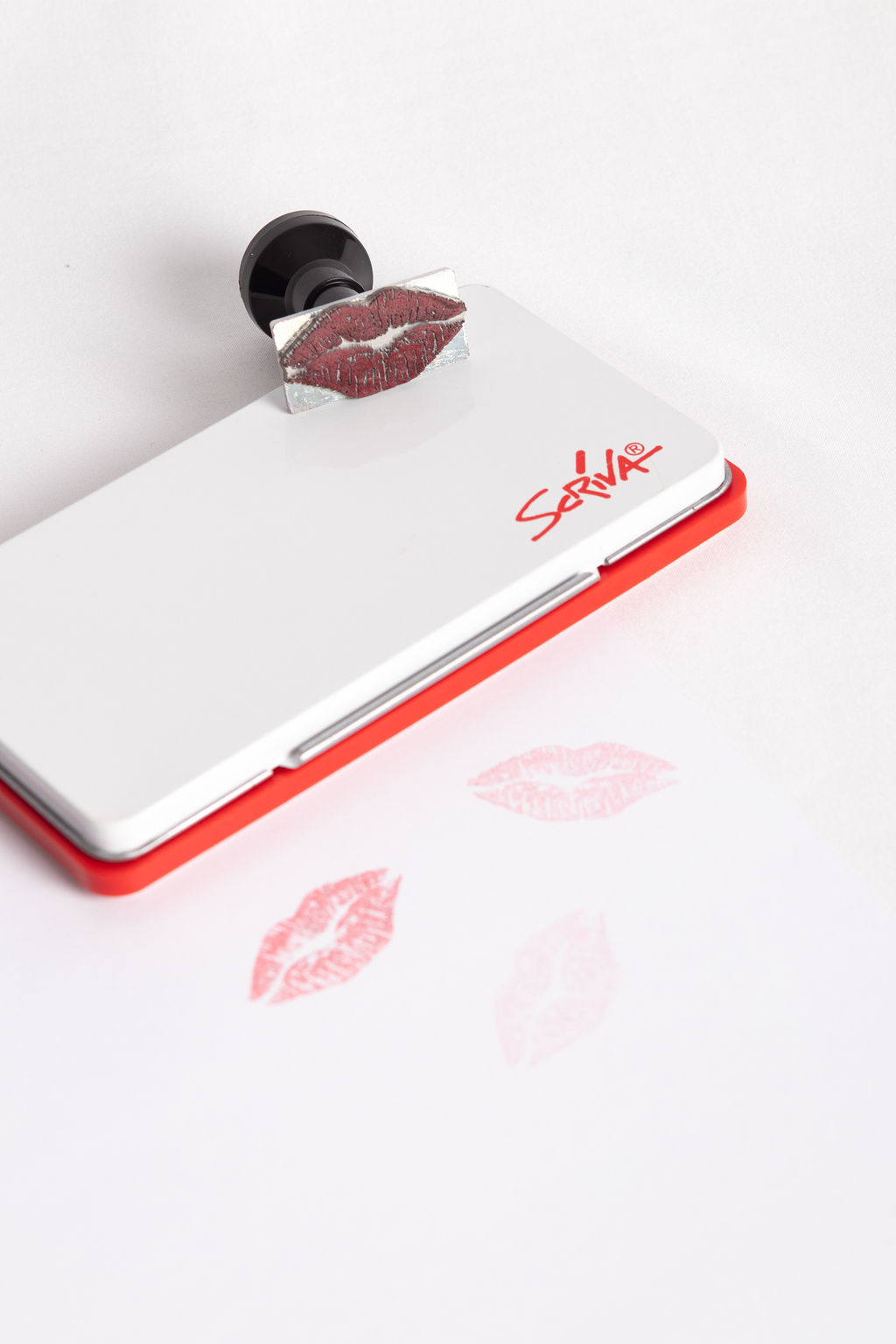 Carimbo tradicional metálico com tinta vermelha. Deixa o beijo da Madame em todas as folhas — ou na pessoa certa.
