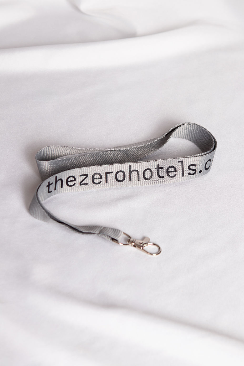 Grey polyester lanyard with silver hook — discreet, functional, and 100% ZERO. Perfect for badges, keys, or your patience (when needed).