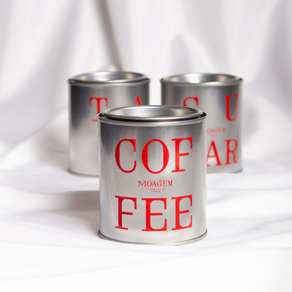 250 ml custom tin container with lid. A utilitarian object transformed into a design piece, with subtle charm to enhance any kitchen or office.